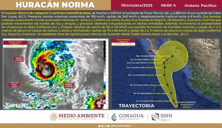 Esta tarde el huracán “Norma”, categoría tres en la escala Saffir Simpson, se ubicó a 380 kilómetros (km) al suroeste de Playa Perúla, Jalisco, y a 630 km al sur sureste de Cabo San Lucas, Baja California Sur, por lo se mantiene zona de vigilancia por efectos de huracán desde Todos Santos hasta Los Barriles.