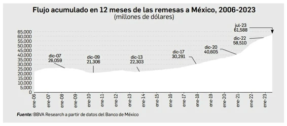 El flujo acumulado en los últimos 12 meses (octubre 2022-septiembre 2023) se situó en una cifra histórica de 62 mil 603 millones de dólares, superior al flujo acumulado a 12 meses registrado en agosto pasado de 62 mil 28 millones de dólares (septiembre 2022-agosto 2023).