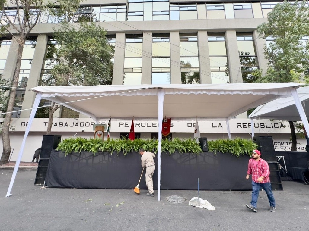 Para la ocasión, se han instalado dos carpas blancas, en una de ellas se colocó un atril con el escudo del STPRM y en la otra un escenario con luces, equipo de sonido e instrumentos de un grupo musical.