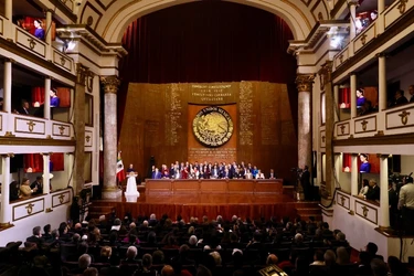 La presidenta Claudia Sheinbaum ofrece un discurso durante la ceremonia por el 108 aniversario de la Promulgación de la Constitución Política de los Estados Unidos Mexicanos de 1917, en el Teatro de la República, en Querétaro, el  5 de febrero de 2025. Foto Luis Castillo