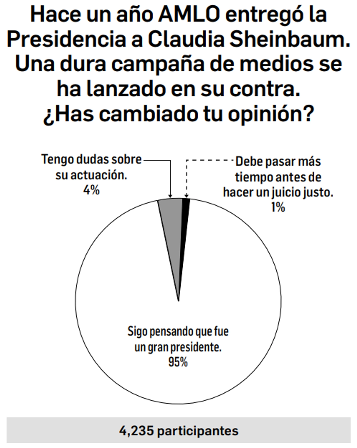 Hace un año AMLO entregó la Presidencia a Claudia Sheinbaum. Una dura campaña de medios se ha lanzado en contra del ex presidente. ¿Has cambiado tu opinión? Este es el tema del sondeo la última semana en redes sociales. Los resultados aparecen en la gráfica.