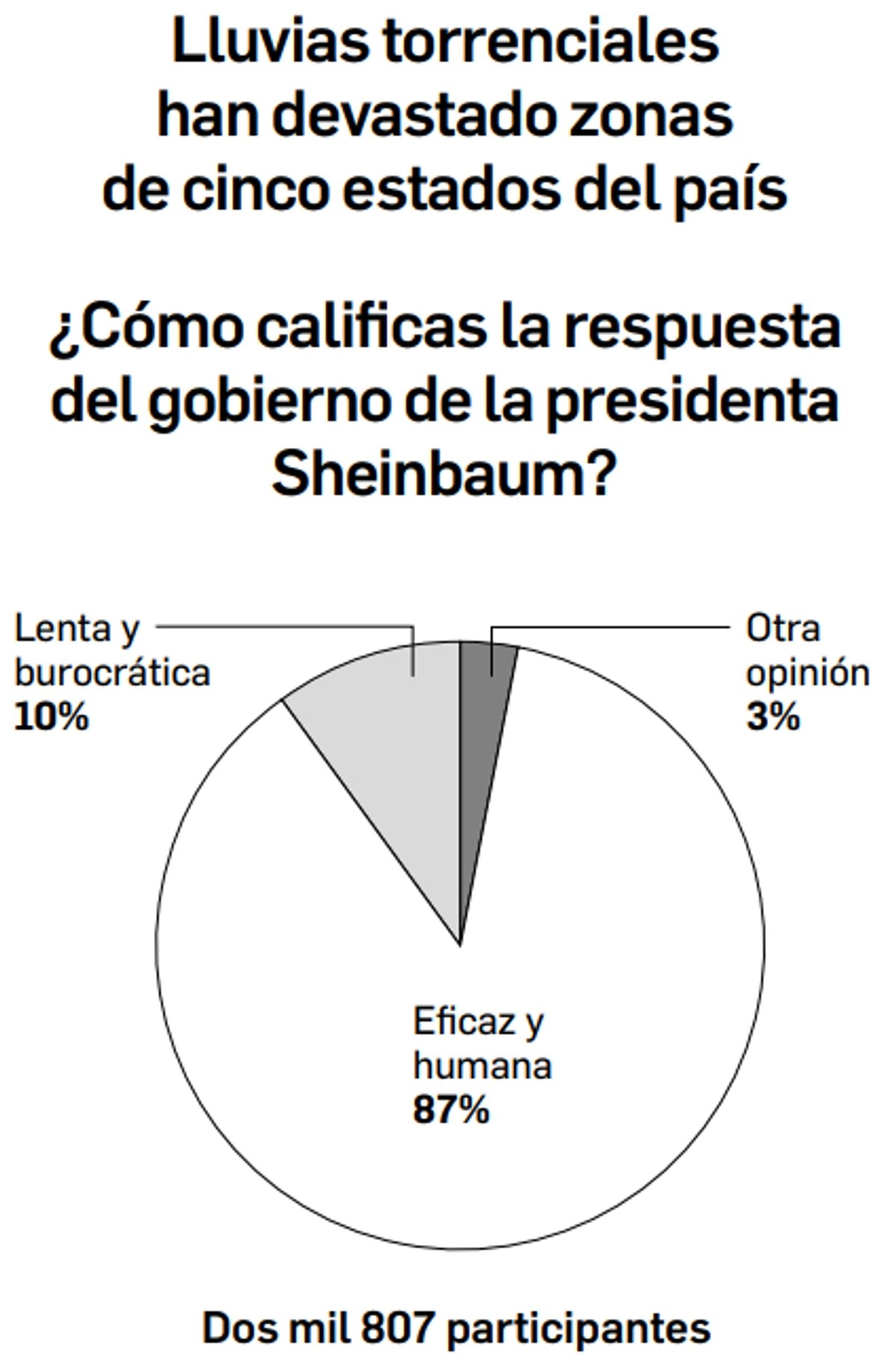 Lluvias torrenciales han devastado zonas de cinco estados del país ¿Cómo calificas la respuesta del gobierno de la presidenta Sheinbaum? Este es el tema del sondeo en redes sociales de esta semana. Los resultados pueden verse en la gráfica.