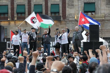 Grupos de estudiantes y decenas de personas se congregan en la Plaza de las Tres Culturas para participar en la marcha por los 57 años de la masacre estudiantil de Tlatelolco.