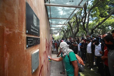 Un grupo de encapuchados aprovechó una protesta de familiares de los 43 para hacer pintas y causar destrozos en la sede diplomática israelí en CDMX.