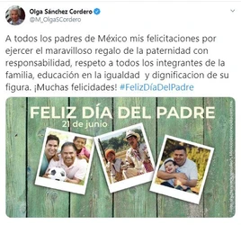 “A todos los padres de México mis felicitaciones por ejercer el maravilloso regalo de la paternidad con responsabilidad”, escribió la secretaria de Gobernación en sus redes sociales.