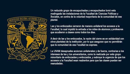 Reprobó las acciones "unilaterales y de fuerza, contrarias a los intereses de las y los universitarios, como la realizada por este grupo minoritario de embozadas y embozados".