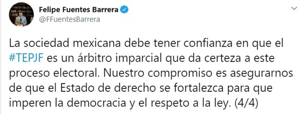 “Nuestro compromiso es asegurarnos de que el estado de derecho se fortalezca para que impere la democracia y el respeto a la ley”, señaló el magistrado presidente del Tribunal en sus redes sociales.