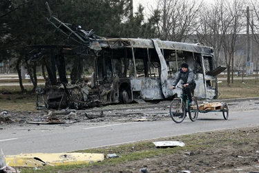En Mariúpol, a 15 km de la línea del frente con la República Popular de Donetsk, algunos residentes esperaban en las paradas de autobús camino al trabajo.
