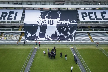 Procesión solemne ante su féretro en el Estadio Vila Belmiro. Su ataúd, sobre la cancha donde marcó algunos de los mejores goles en su carrera. Falleció a los 82 años.
