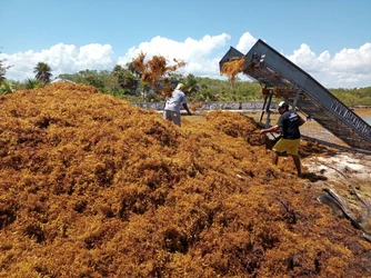 El sargazo llegó a las playas de Mahahual, con un olor nauseabundo debido a la combinación de peces muertos y el ácido sulfhídrico que desprende el alga en descomposición.