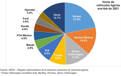 En julio de 2021 se fabricaron 26.5% menos vehículos ligeros que en el mismo mes del año anterior, el acumulado del año se incrementó 20.2%. La exportación de vehículos ligeros registró una disminución de 23.6% durante el séptimo mes del año, mientras el acumulado enero–julio creció 22.0%.