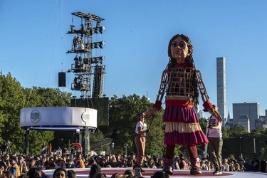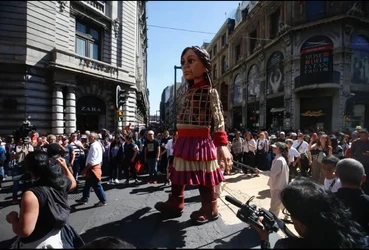 La Pequeña Amal, un títere de unos 3.5 metros de altura, ha visitado 85 ciudades en 12 países en busca de su mamá y llevando un mensaje para refugiados y migrantes.