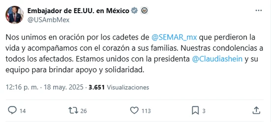 El embajador de Estados Unidos en México escribió en su cuenta de X “nos unimos en oración por los cadetes de la Secretaría de Marina que perdieron la vida y acompañamos con el corazón a sus familias”.