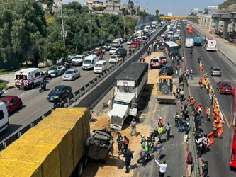 Tres tráilers, una ambulancia del IMSS y varios autos se impactaron entre si. La vía con dirección a la Ciudad de México continúa bloqueada.