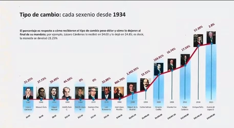 Con Zedillo, la devaluación fue de 169%, con Fox, de 16.74%, con Calderón, de 17.54% y en con Peña, 57.39%, señaló al mostrar una gráfica.