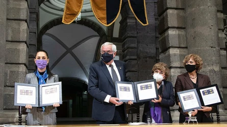 Junto con la jefa de Gobierno, el rector Enrique Graue canceló una estampilla postal por los 100 años del escudo y del lema universitario.