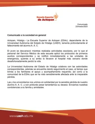Muere estudiante en la Escuela Superior de Actopan de la UAEH