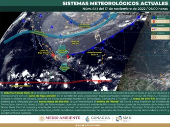De igual forma, añadió, se mantendrá viento de componente norte con rachas de 60 a 80 km/h y olas de 2 a 4 metros de altura en el Istmo y Golfo de Tehuantepec.