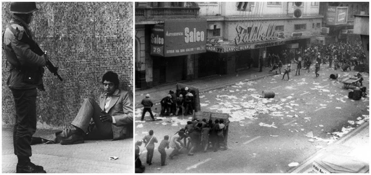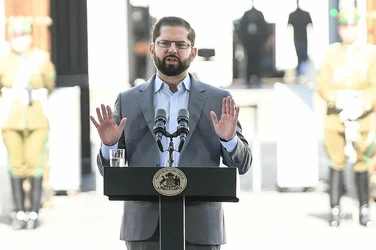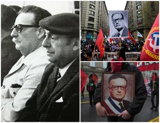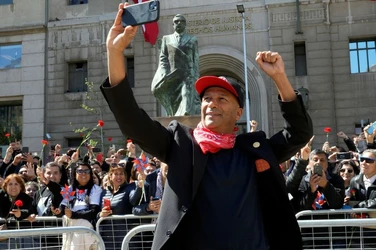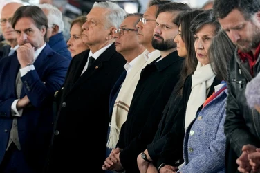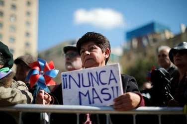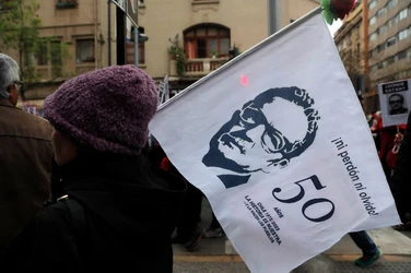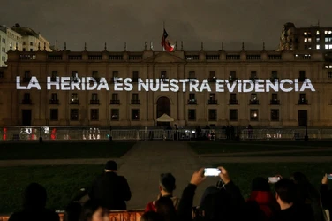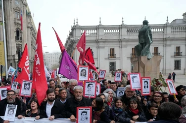 Santiago, Chile. 10 de septiembre de 2023. Miles de chilenos marcharon el domingo por los detenidos desaparecidos y ejecutados durante la dictadura de Augusto Pinochet, en la víspera del 50 aniversario del golpe de Estado de 1973 contra el presidente Salvador Allende. El presidente Gabriel Boric se sumó a los manifestantes al llegar al palacio presidencial de La Moneda, donde algunos encapuchados vestidos de negro lanzaron bengalas y objetos en torno al edificio, derribaron vallas de seguridad y quebraron ventanales. Agentes antidisturbios disolvieron a los encapuchados con gases lacrimógenos y tanquetas lanza aguas. Tres personas fueron detenidas y tres uniformados resultaron heridos, según el parte del gobierno. El mandatario chileno se metió a la marcha y se juntó con manifestantes que llevaban pancartas con rostros de personas desparecidas y en que se leía “¿Dónde están?”. La dictadura de Pinochet (1973-1990) dejó en Chile tres mil 200 asesinados y mil 162 desaparecidos, incluidos niños, según organismos de derechos humanos. (Vía Ap y Afp)