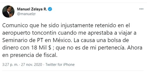 Manuel Zelaya se encontraba en el aeropuerto Tocontín para viajar a México cuando se percataron de la bolsa que contenía el dinero.