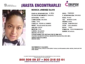 La Cobupem activó una cédula para la localización de Mónica Jiménez Olivo, de 47 años de edad, quien desapareció el pasado 7 de enero.