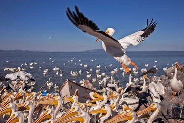 El pelícano borregón, especie migratoria que viaja desde Canadá y EU.