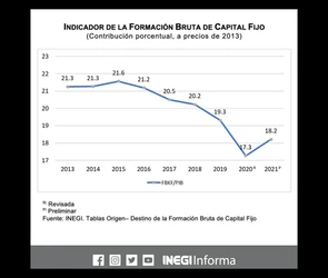 El indicador de formación bruta de capital fijo como contribución porcentual del PIB se situó en 18.2% ese año; en 2020 explicó 17.3% del PIB nacional.