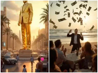El magnate retrata lo que según él debe ser el enclave reconstruido tras la guerra: un balneario de lujo con yates, bailarinas y estatuas doradas de su figura.